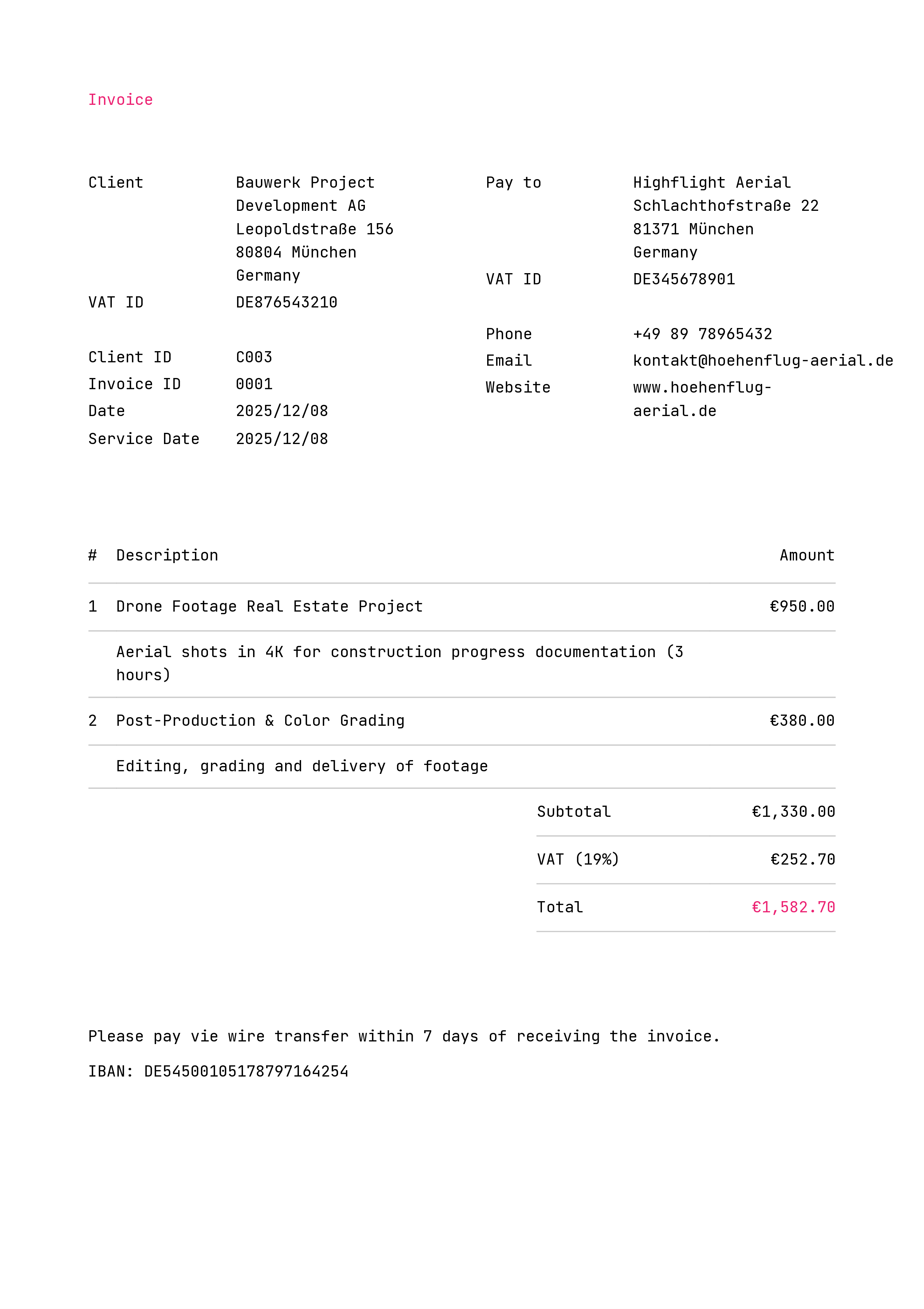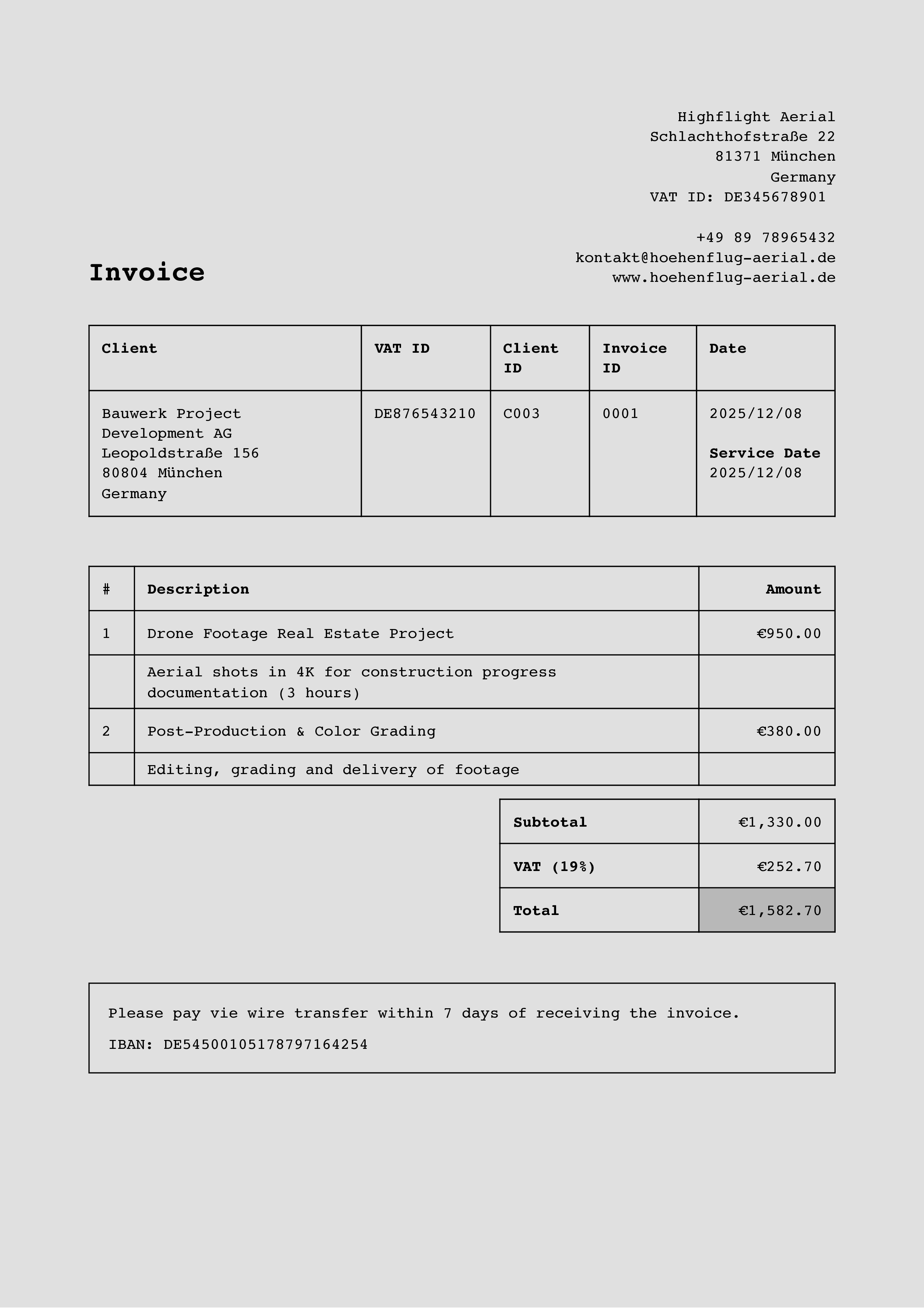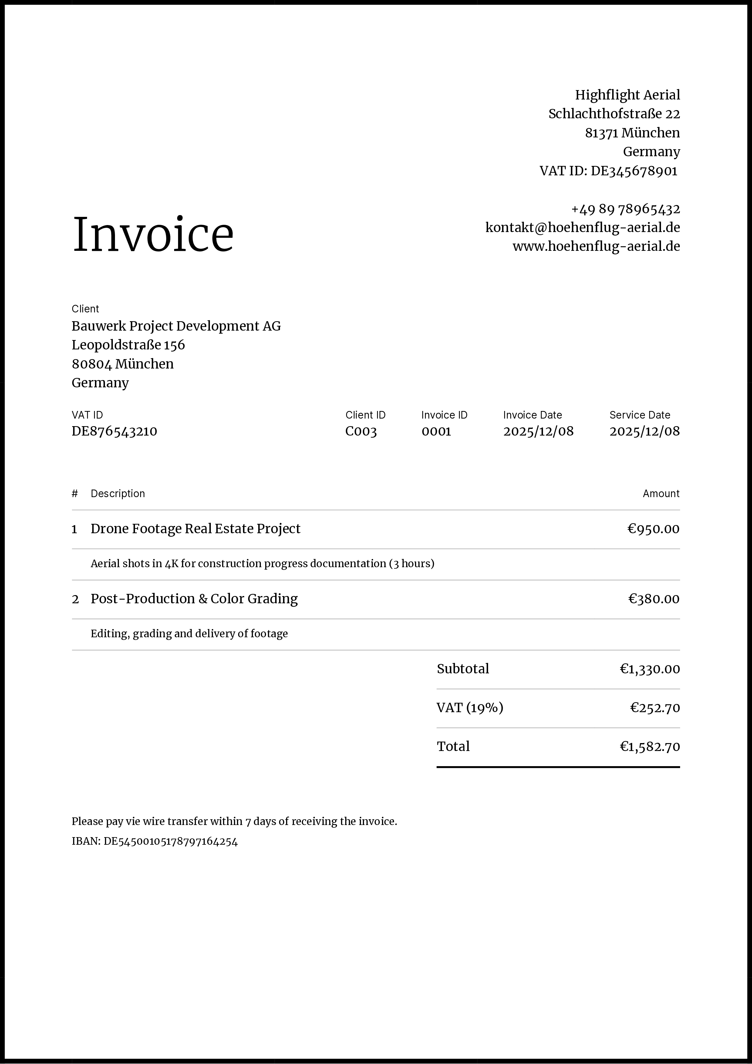 Define your own invoice, proposal and client number formats using variables to ensure gapless and sequential numbering.