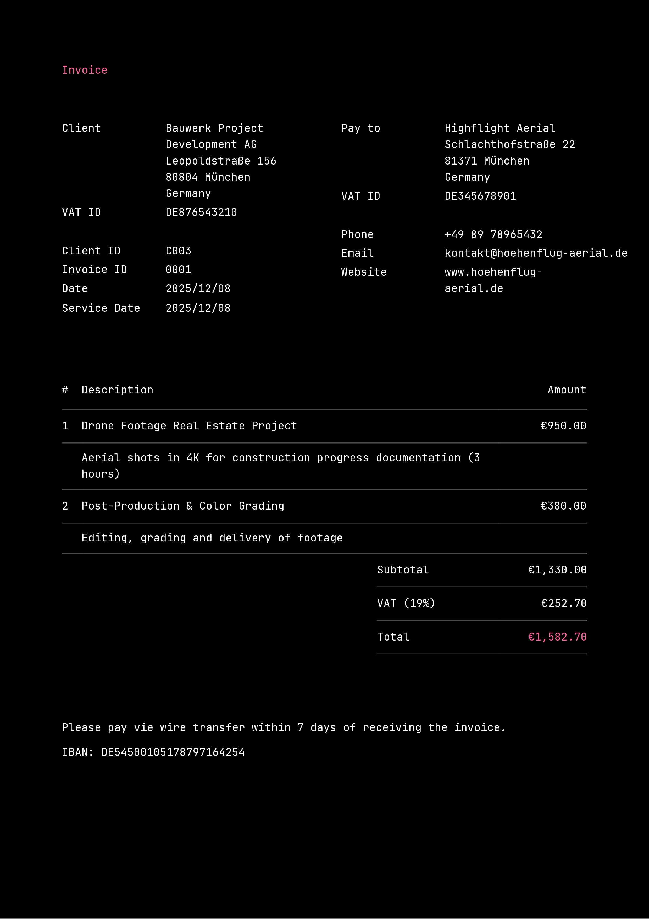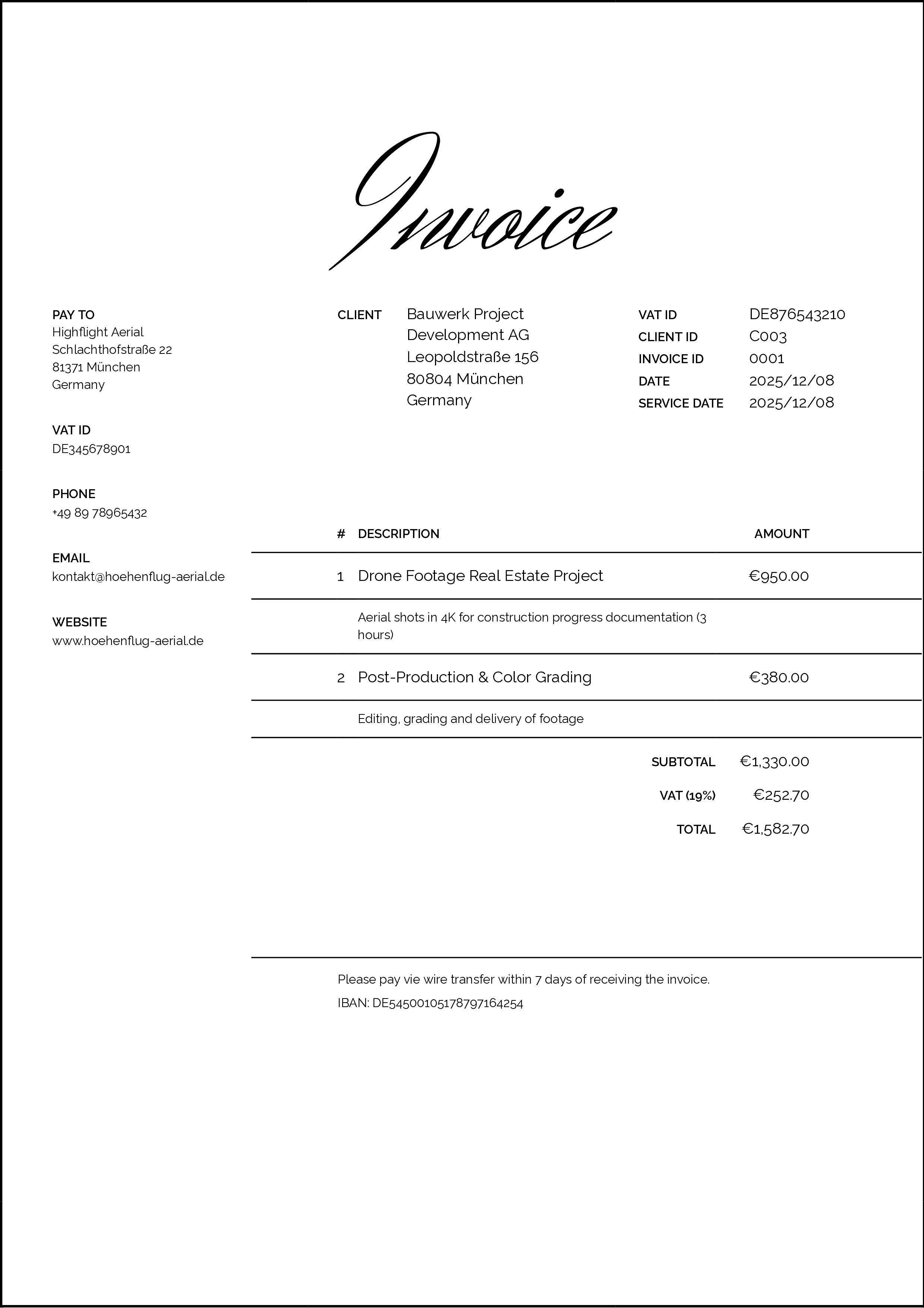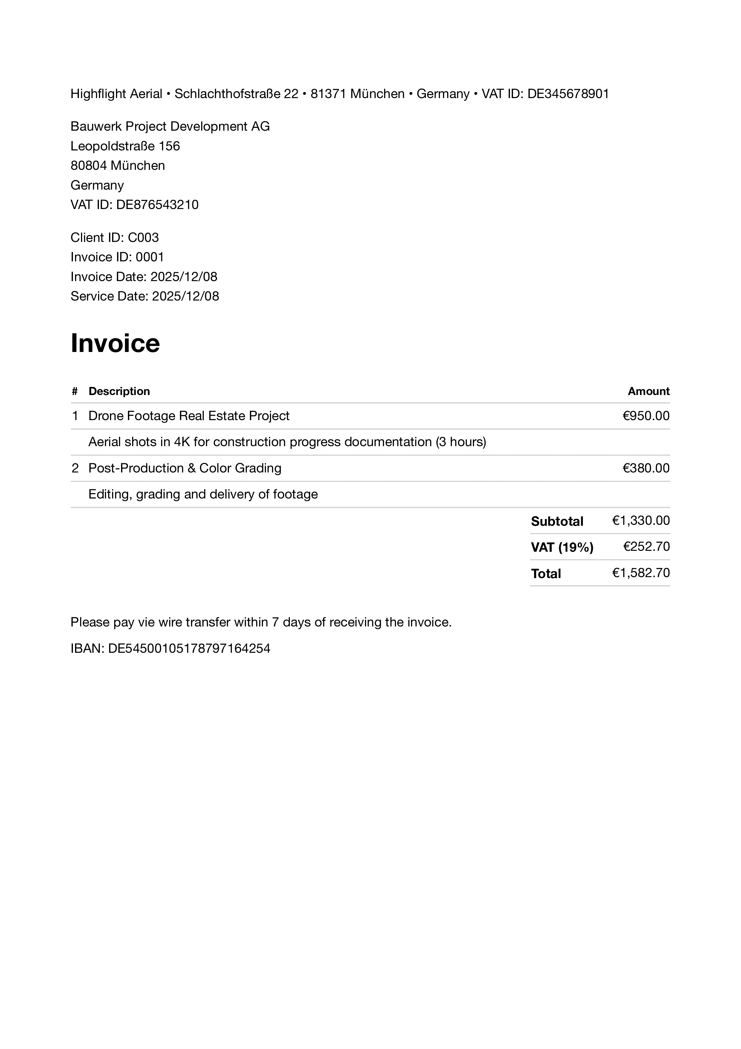 Define your own invoice, proposal and client number formats using variables to ensure gapless and sequential numbering.