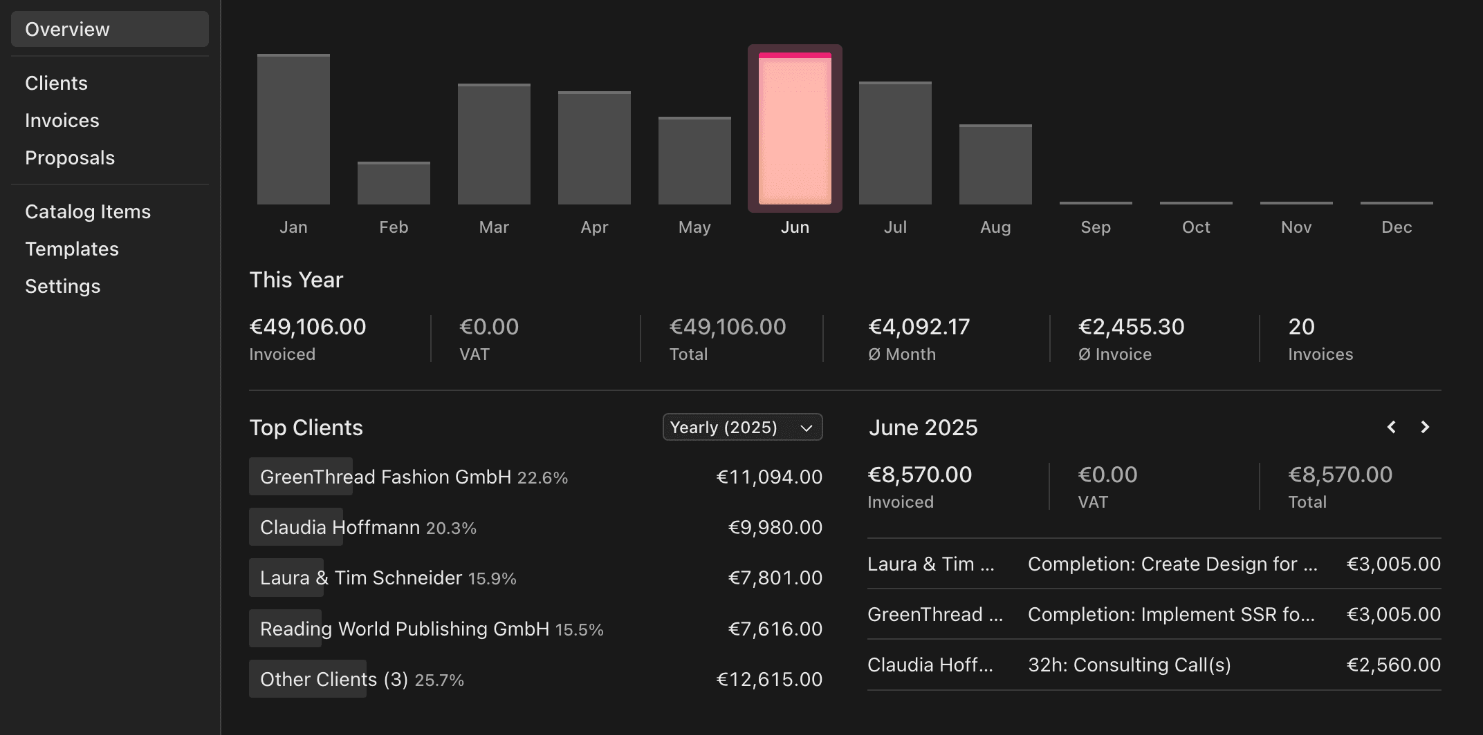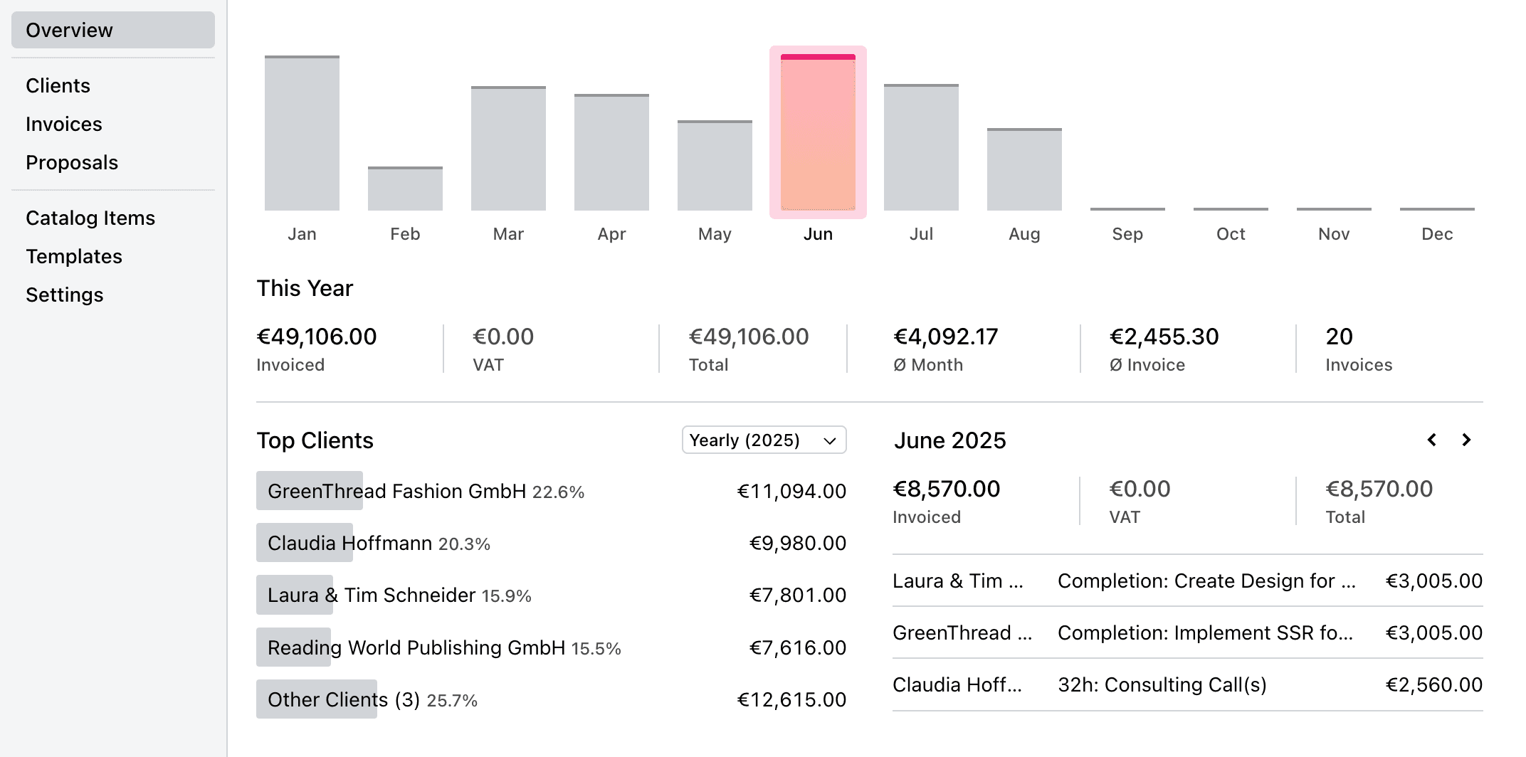 See who your most valuable clients are and easily access all your clients' information, invoices and proposals.